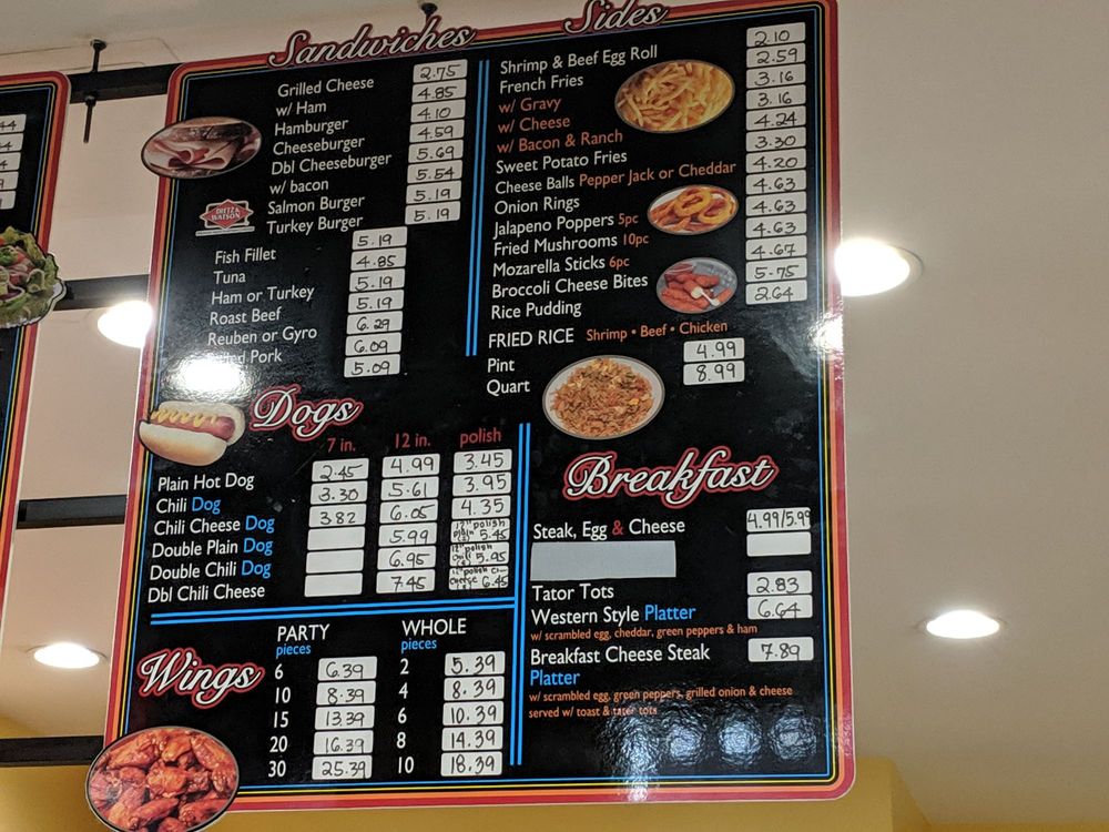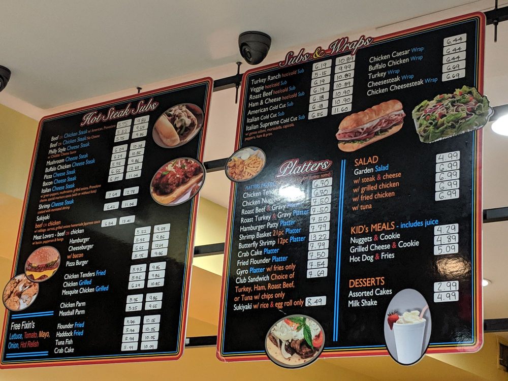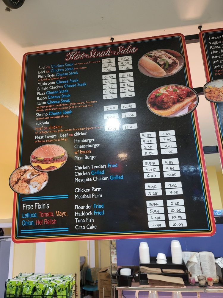 Real Rib Eye Beef Steak or Chicken Steak on a sub roll with Green Pepper or Banana Pepper or Sweet Pepper, lettuce, tomato, mayo, fried onions, and cheese, 1 Choice of Side and 1 choice of soda in can, homemade or fountain drinks.